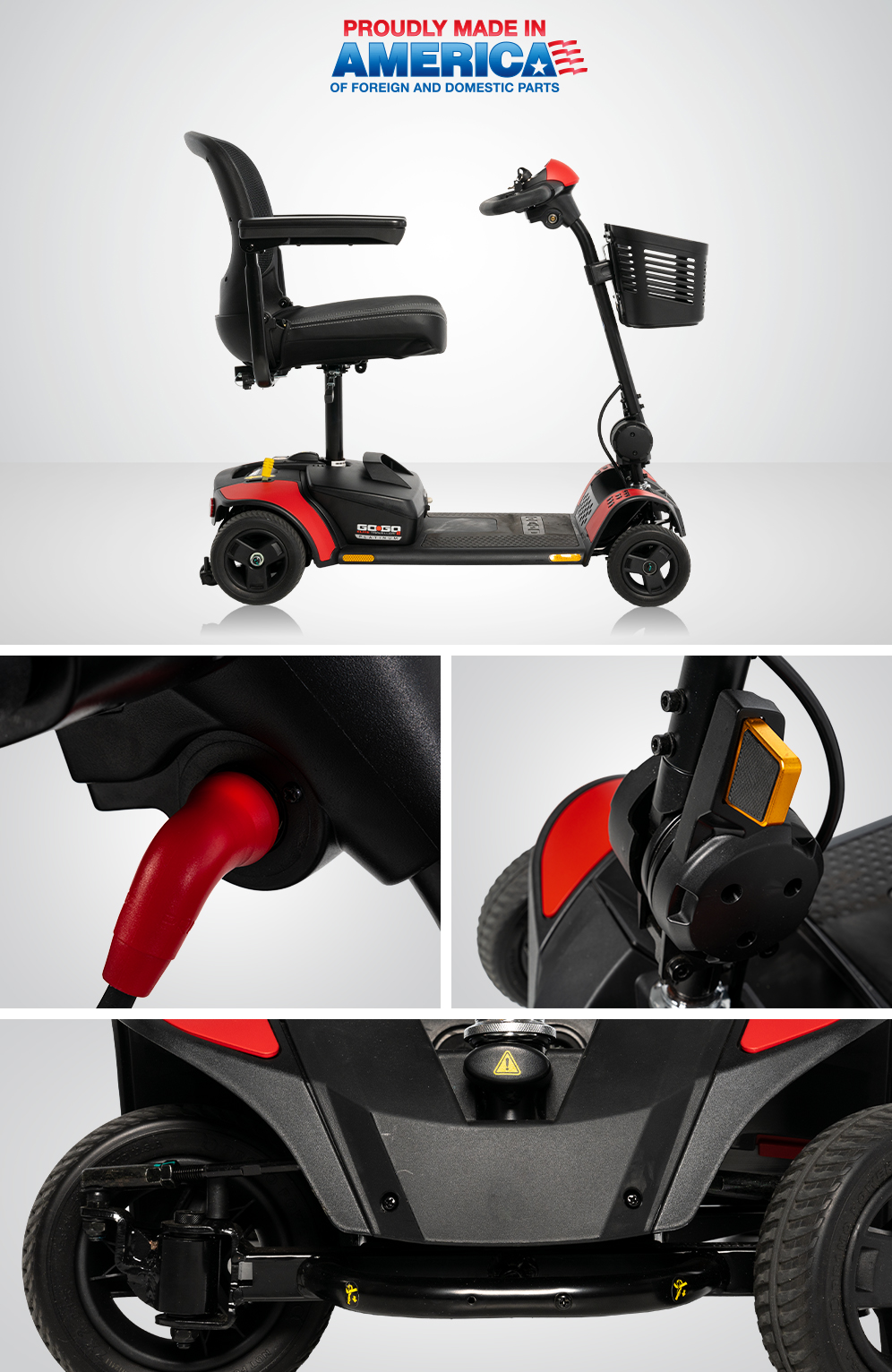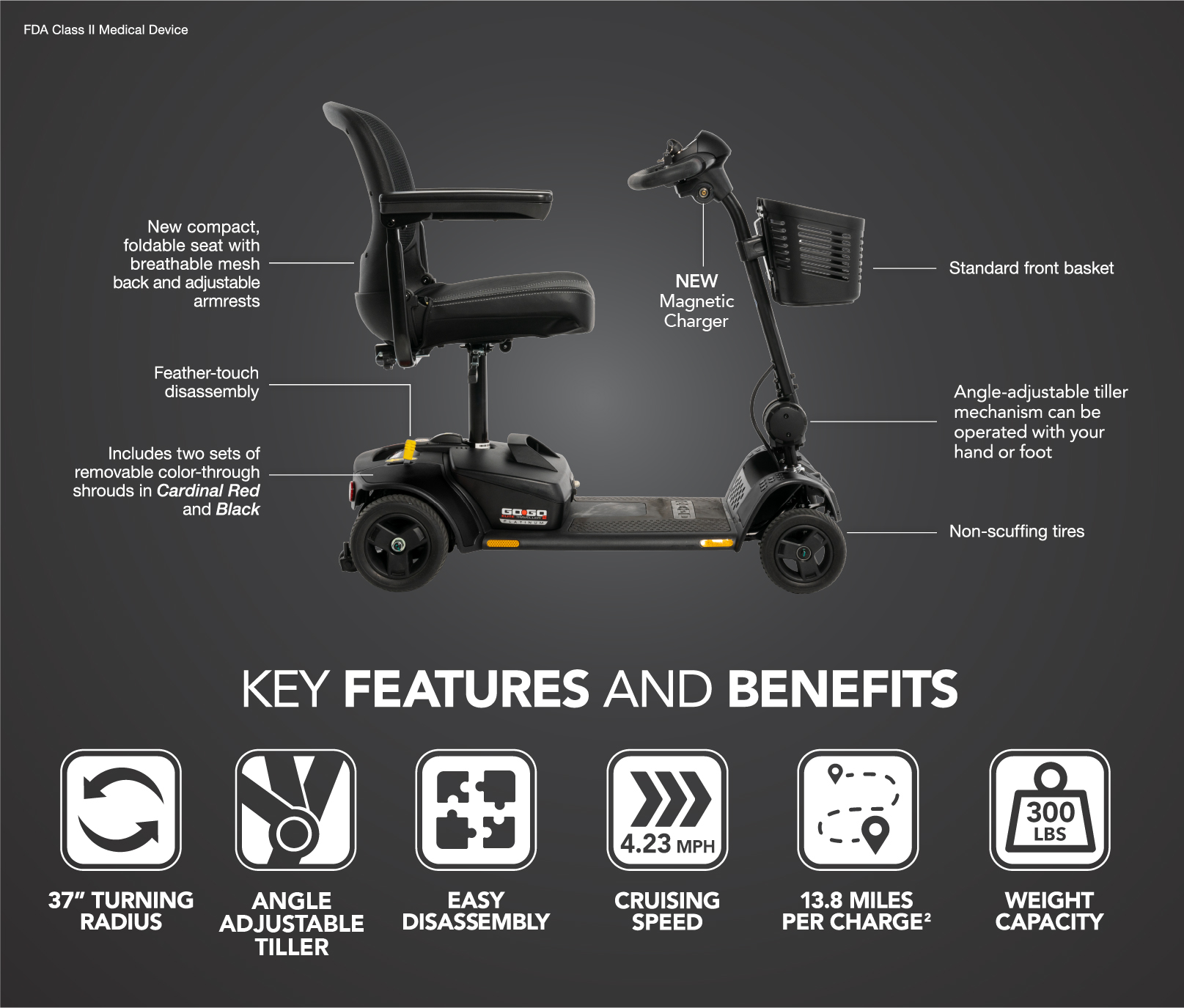 - EZ Turn technology for the tight turning of a 3-wheel scooter and the stability of a 4-wheel (turning radius of 37”)